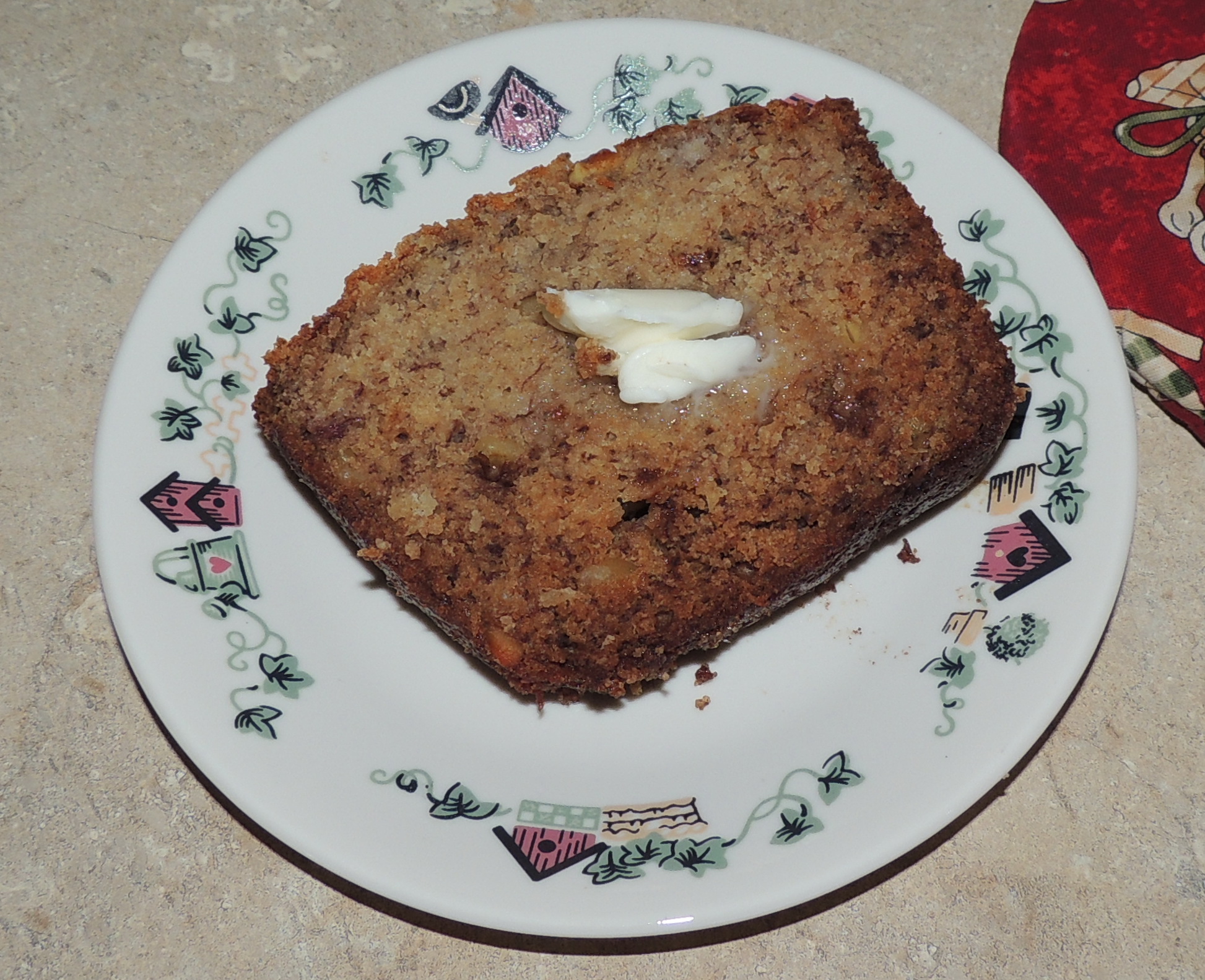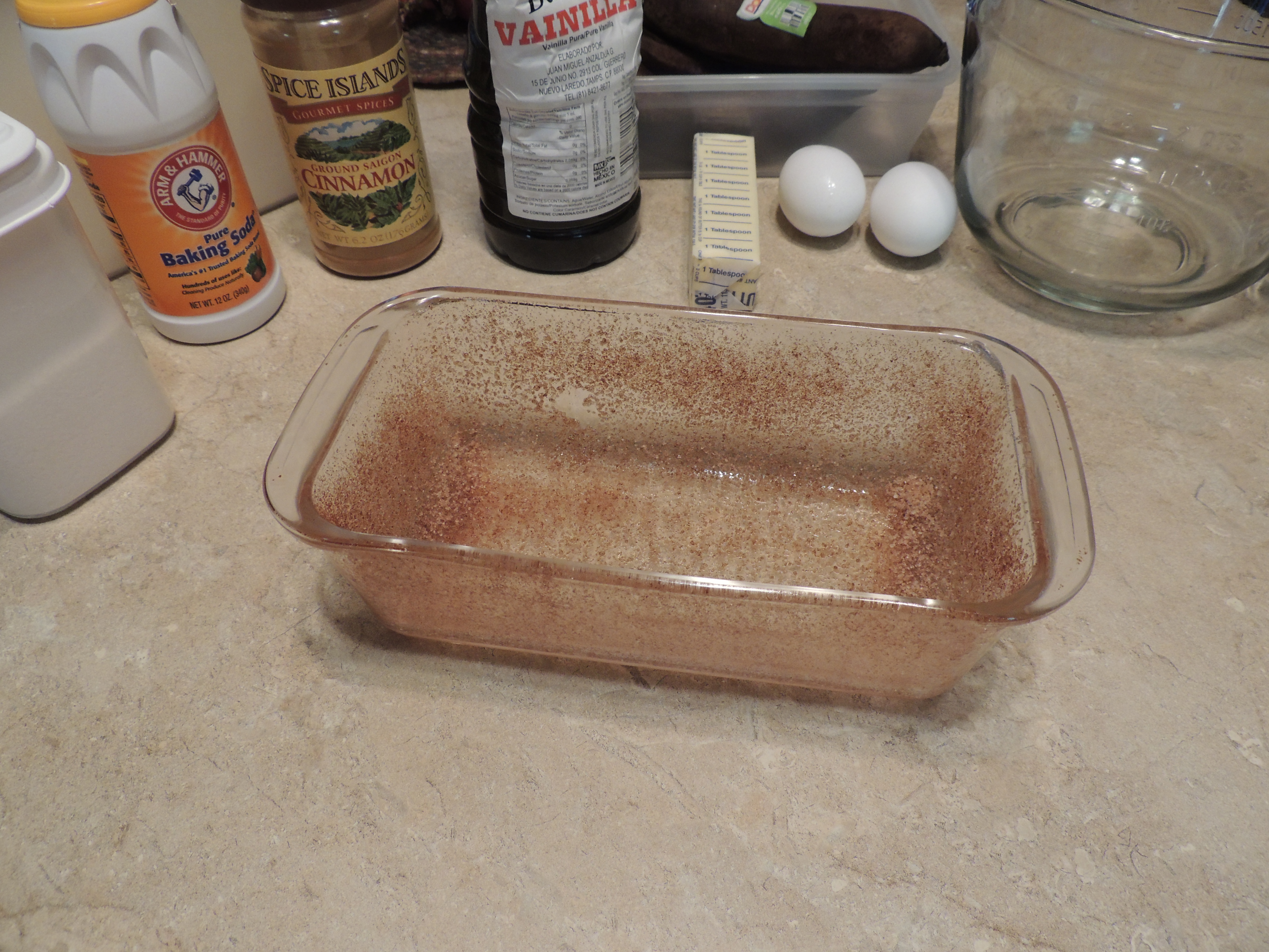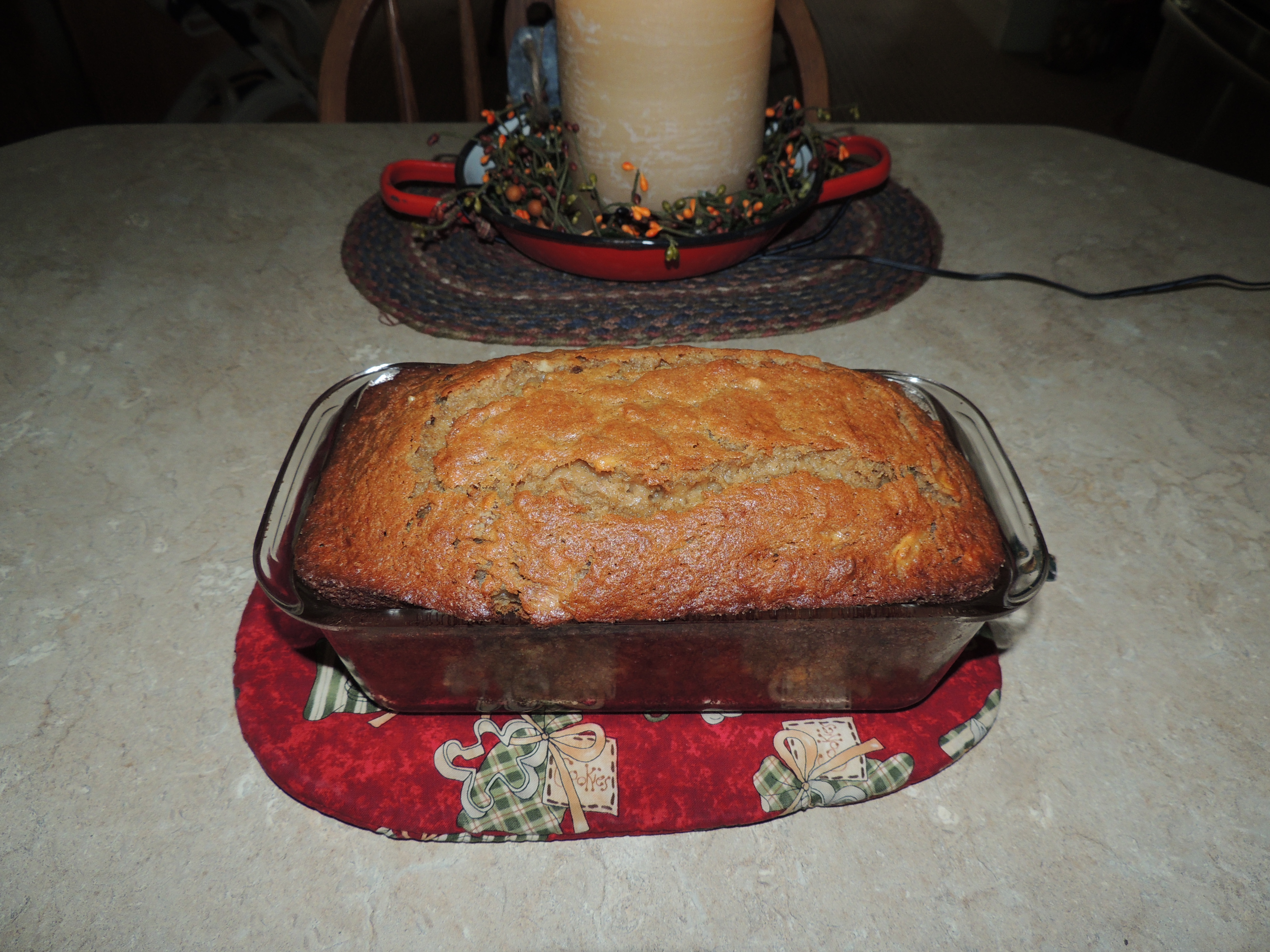 NOTE: When I bake sweet breads I always grease my loaf pans and I have a jar of Cinnamon/Sugar Mix – I sprinkle cinnamon/sugar over the greased loaf pan/pans – love the cinnamon sugary crust!