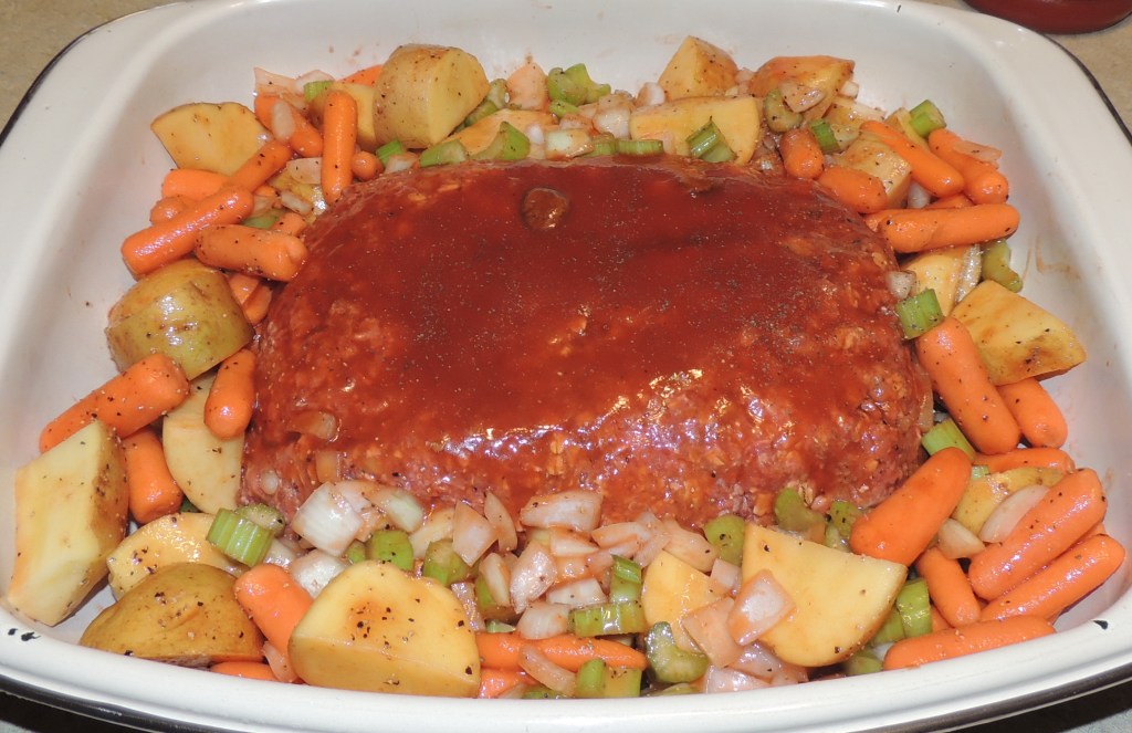 Mix all of the above together – Save about 1/2 cup tomato juice and pour over top of meat before baking. Bake 350º for one hour or until veggies are done. If your meatloaf is thicker may take a little longer. Oh, so Good!
