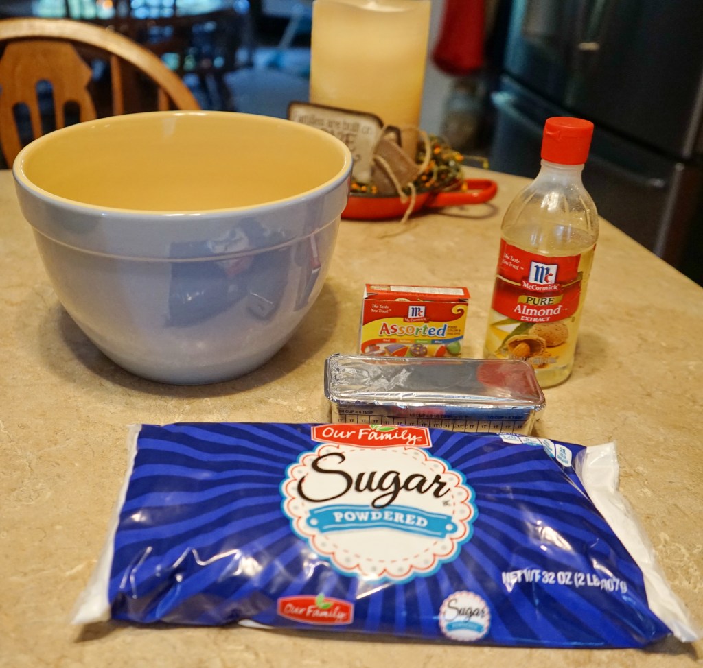 Using a mixer cream shortening until fluffy. Add confectioners’ sugar 1 cup at a time and continue mixing until well blended. Add almond extract, food coloring and whipping cream – adding the whipping cream/milk small amounts at a time while mixing on low speed until moistened. Additional whipping cream/milk may be added if necessary. Beat at high speed until frosting is nice and fluffy.