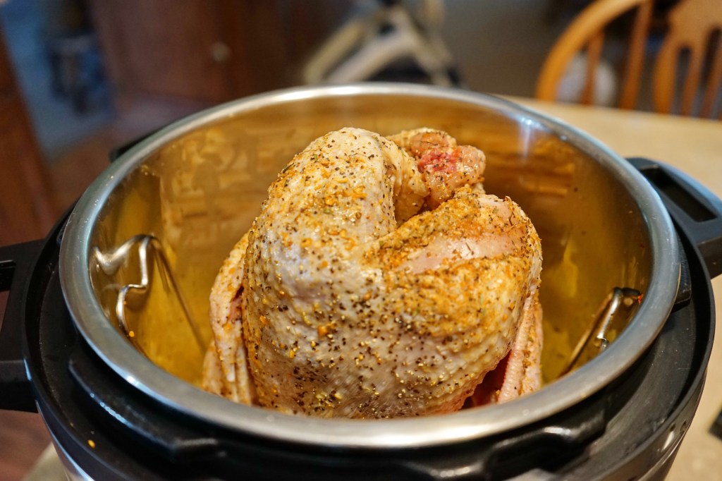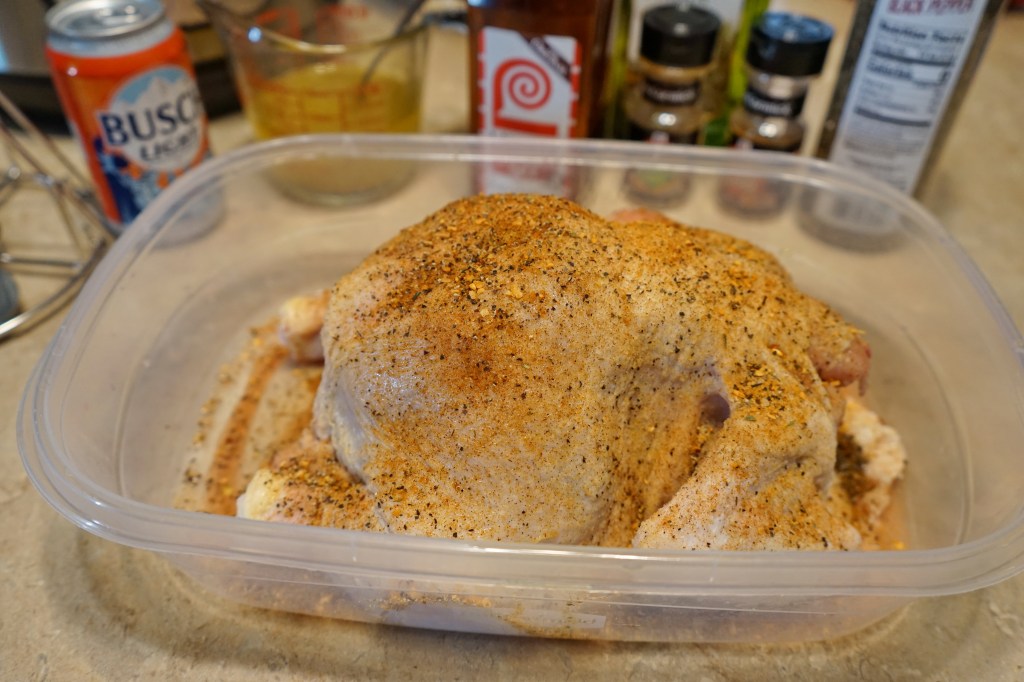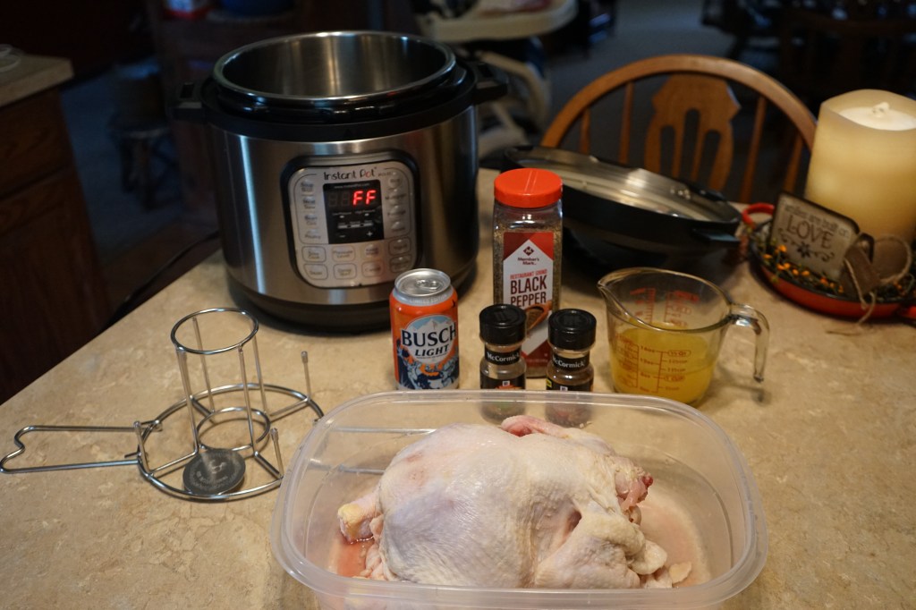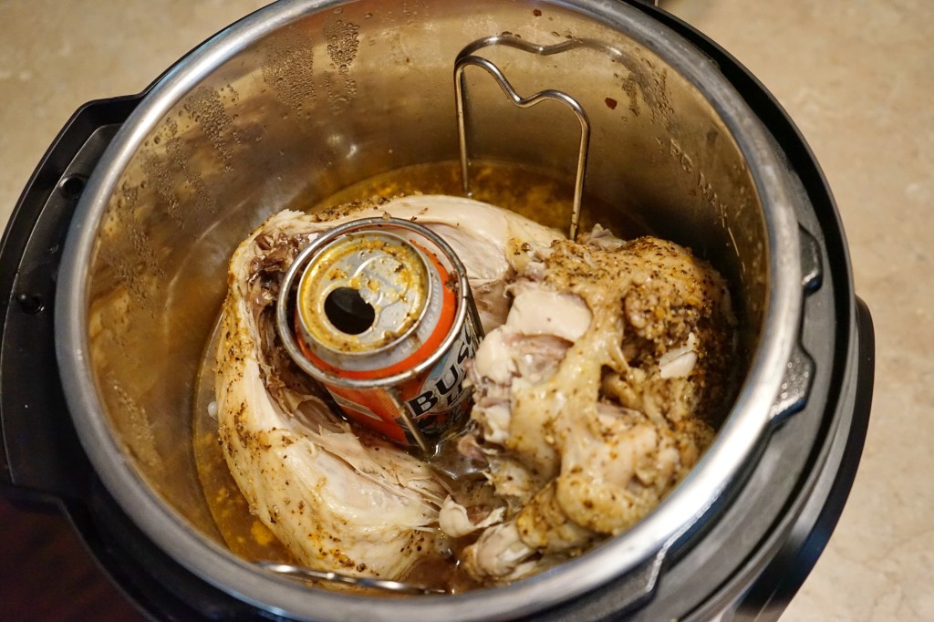 If you have a rack put your beer can in the center of the rack – if you don’t have a rack put your beer can with remaining beer inside on the bottom, middle, of your Instant Pot. Put the open cavity of your chicken facing down and lower it on to your beer can, insert it as far as it will go inside your chicken.