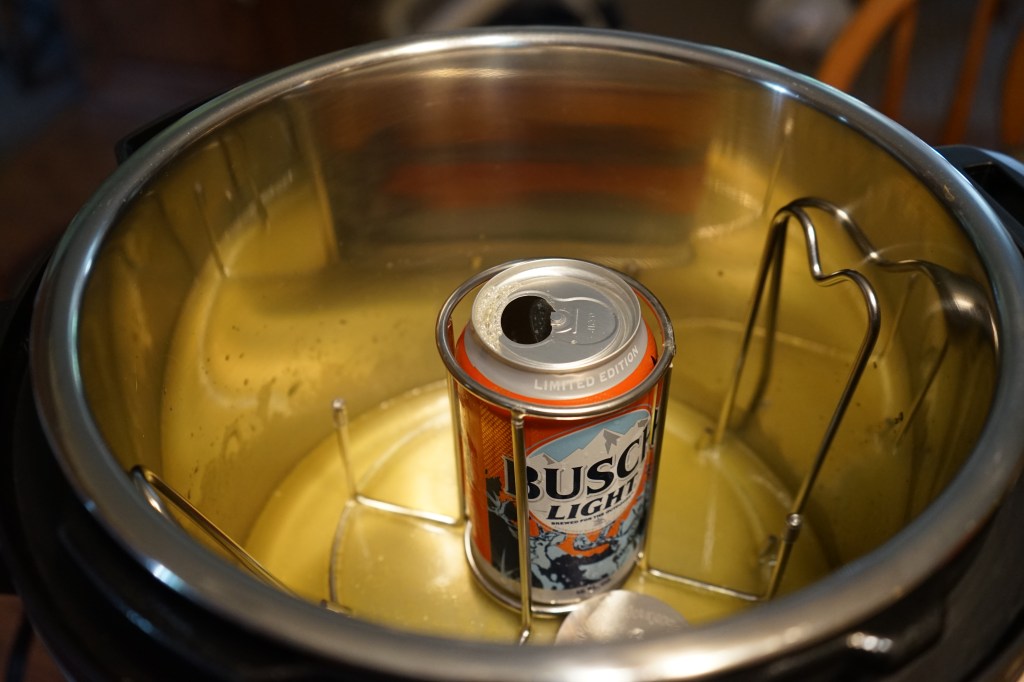 To your Instant Pot add 3/4 of a cup of beer from your beer can and 3/4 cup chicken broth.