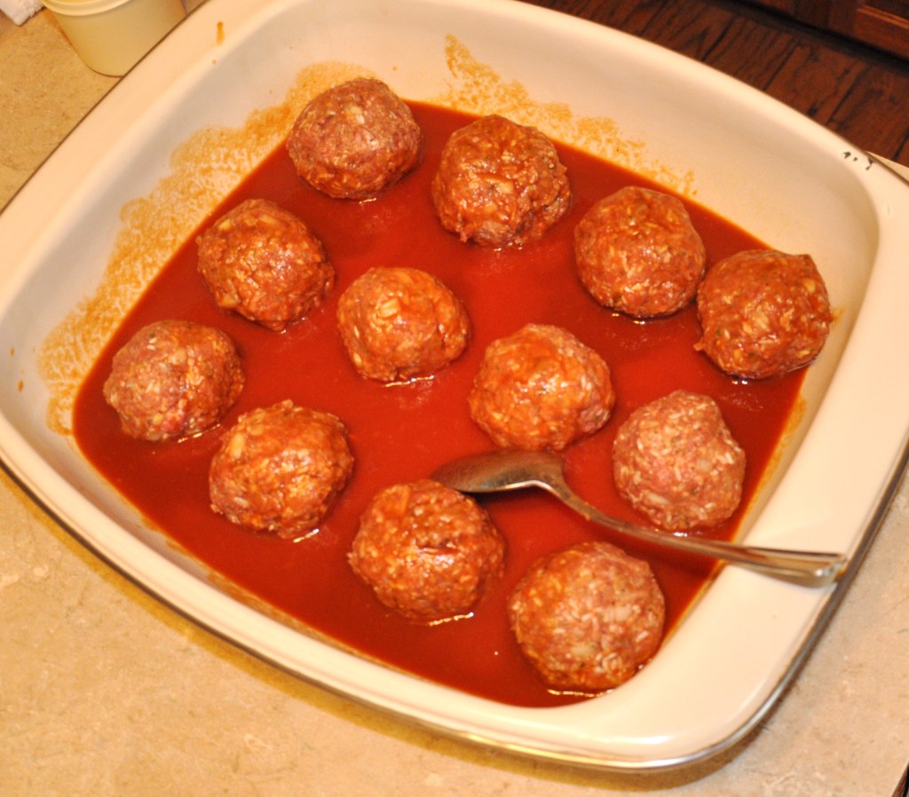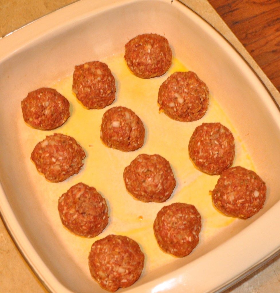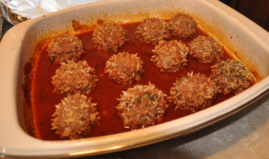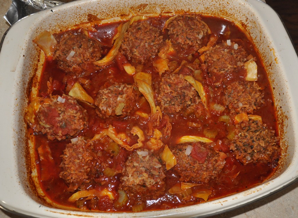 Bake for 35 minutes. Uncover check and make sure you have enough juice (if not more may be added) this is when I like to add in cabbage, onions, green pepper and celery – Cover and continue baking until the tops of the meatballs are lightly browned, 20 – 25 more minutes.