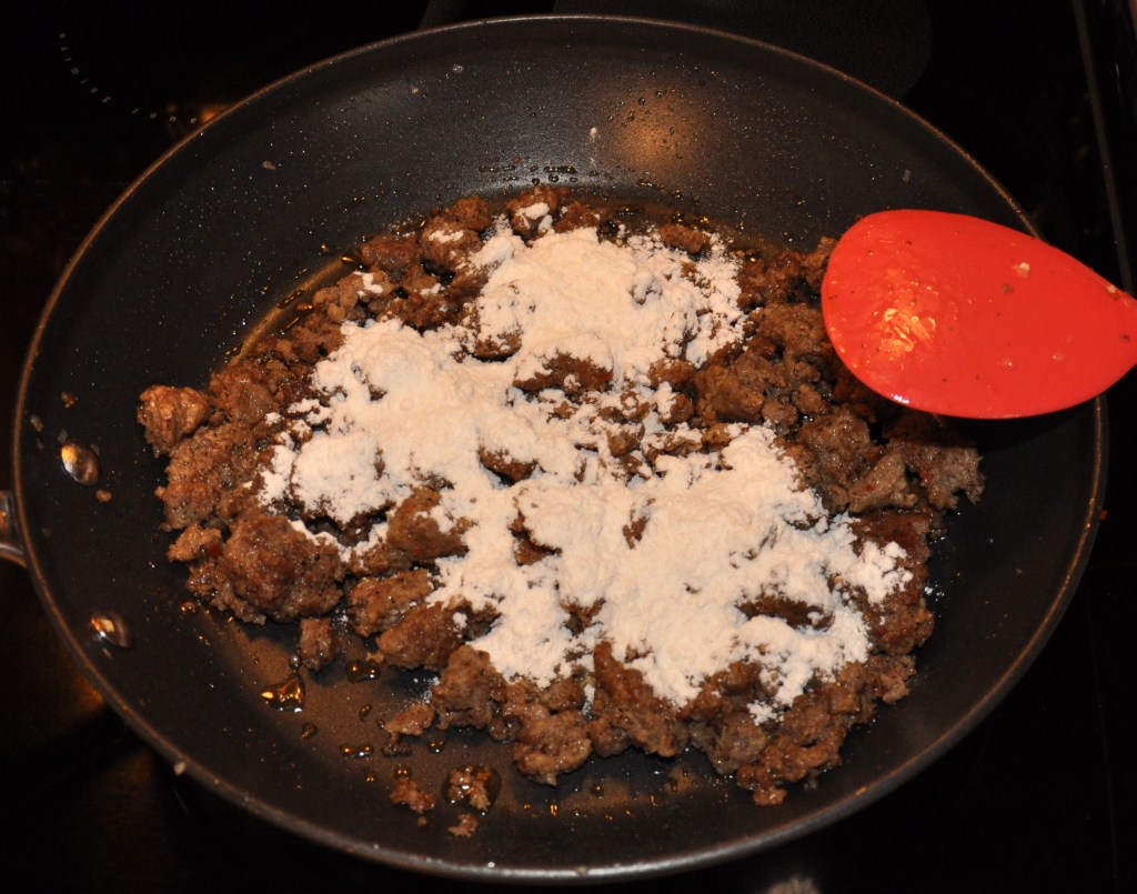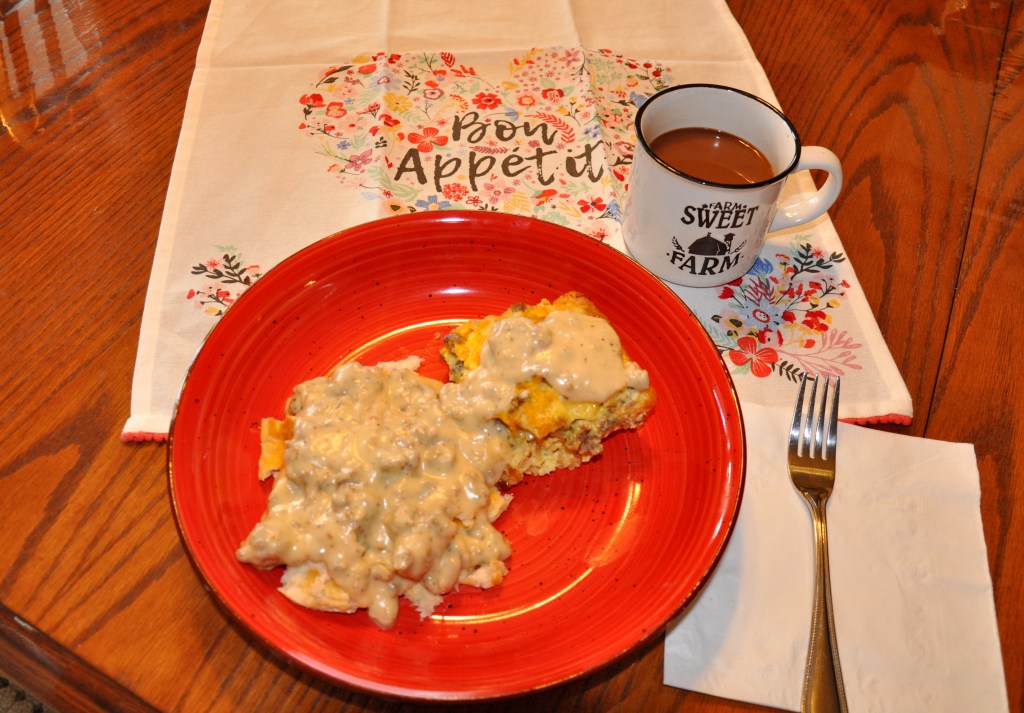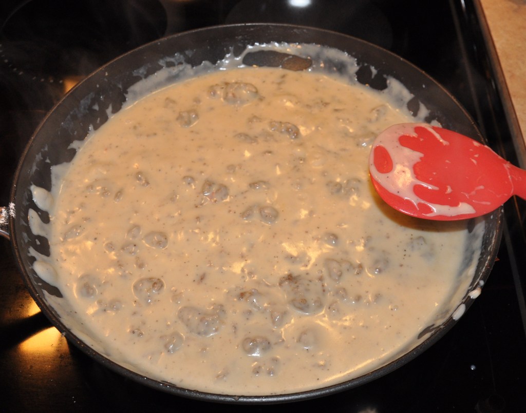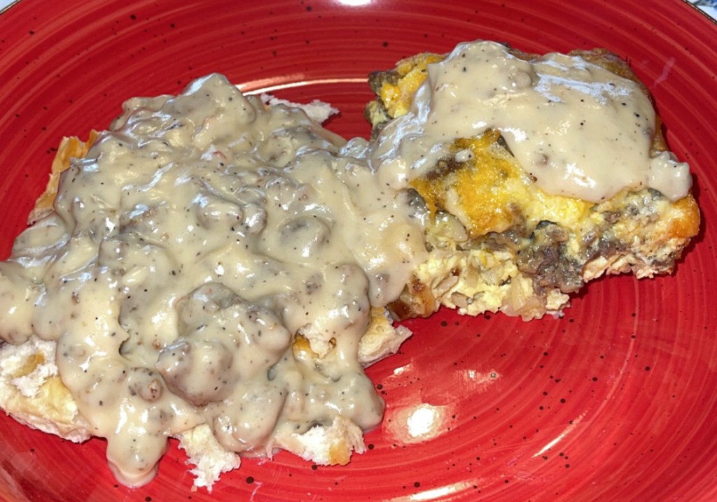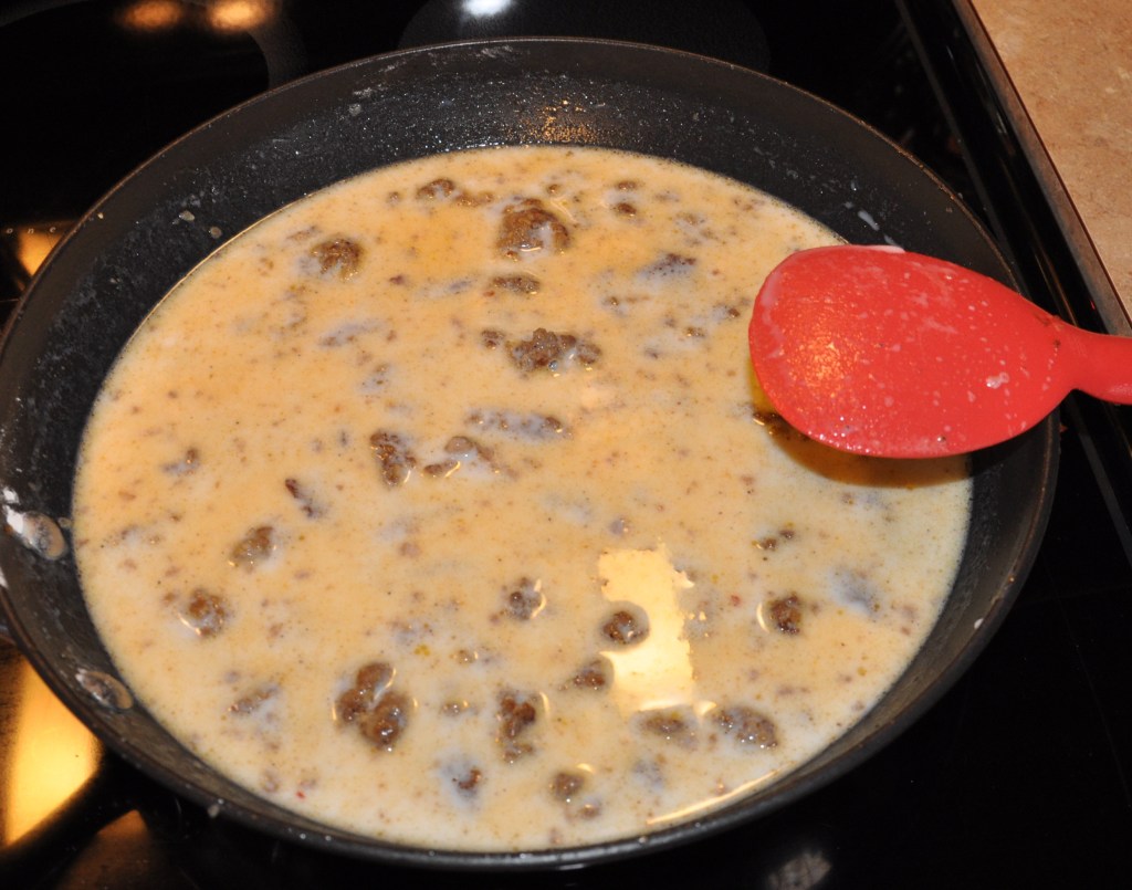 Return the browned sausage to the skillet, reduce the heat to medium low. Sprinkle 1/3 cup of flour and stir – once sausage is coated with flour pour in 3 cups of milk, stirring constantly – if it is too thick add the extra cup – gravy is a judgement thing! Cook the gravy, stirring frequently, until it thickens. (This may take a good 10 to 12 minutes.) Sprinkle in pepper and beef base continue cooking until thick and luscious. If it gets too thick too soon, just splash in another dab of milk. Taste and adjust the seasoning. Spoon the sausage gravy over the casserole or add some biscuits and serve immediately.