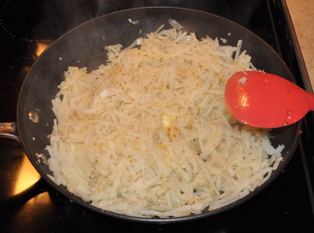 You can use your own shredded potatoes – use 2 or 3 potatoes, shred, OR Use 1 a bag of frozen shredded hash browns. I used Bob Evans fresh hash browns out of convenience.