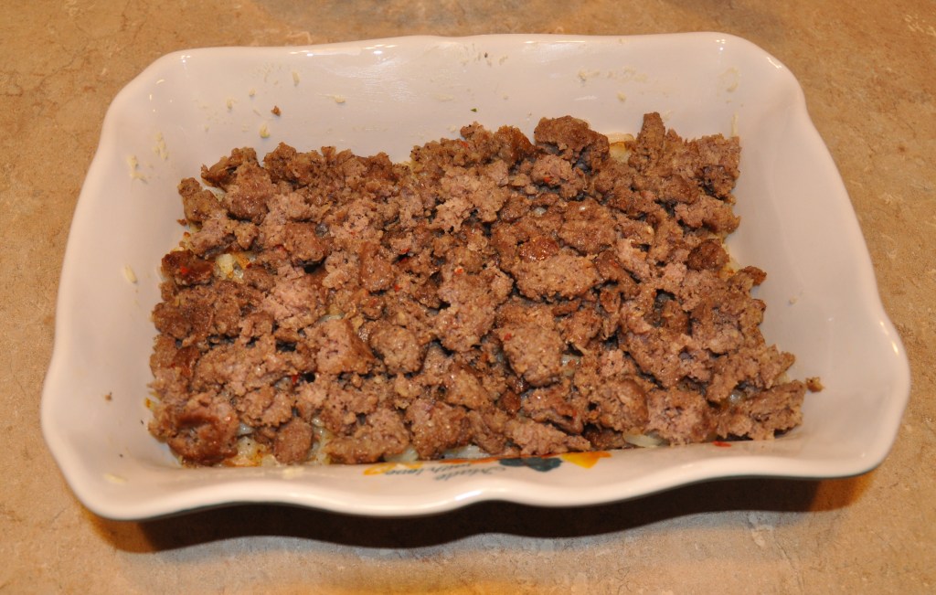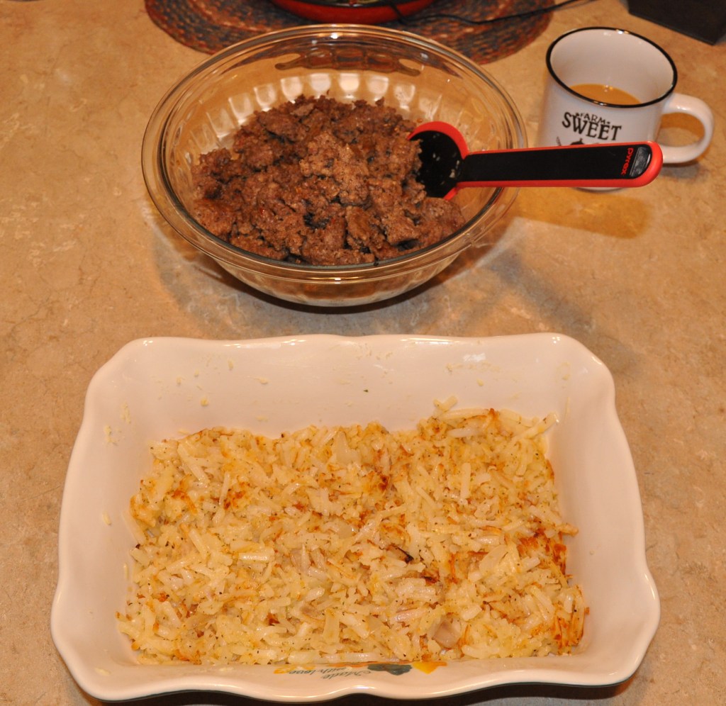 In this casserole I used 2 pounds of sausage – 1 hot and 1 regular – fried them together then divided the sausage in half – used 1 pound for the casserole and 1 pound for sausage gravy.